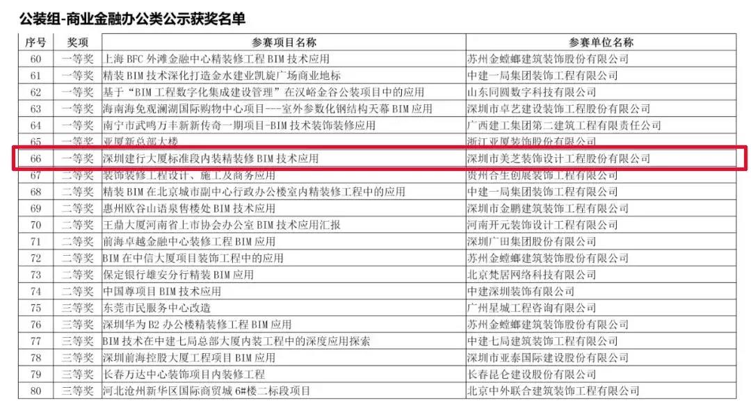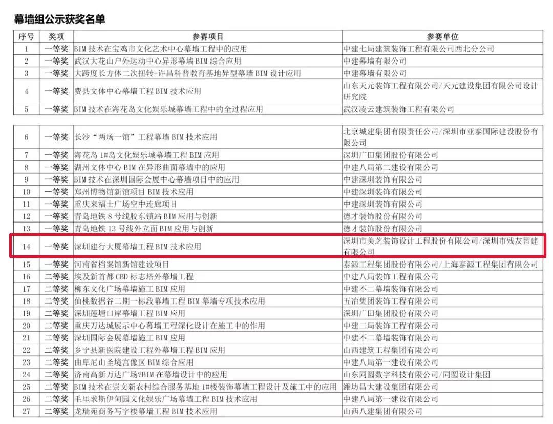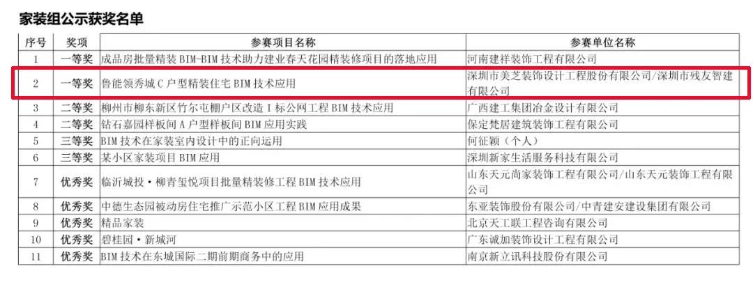 近日,由中國(guó)建筑裝飾協(xié)會(huì)舉辦的“首屆中國(guó)建筑裝飾BIM大賽”評(píng)選結(jié)果發(fā)布,深圳市美芝裝飾設(shè)計(jì)工程股份有限公司(以下稱“美芝股份”)以超強(qiáng)的實(shí)力斬獲三項(xiàng)一等獎(jiǎng):“深圳建行大廈標(biāo)準(zhǔn)段內(nèi)裝精裝修BIM技術(shù)應(yīng)用” 獲得公裝組/商業(yè)金融辦公類(lèi)一等獎(jiǎng);“深圳建行大廈幕墻工程BIM技術(shù)應(yīng)用”獲得幕墻組一等獎(jiǎng);“魯能領(lǐng)秀城C戶型精裝住宅BIM技術(shù)應(yīng)用”獲得家裝組一等獎(jiǎng)。