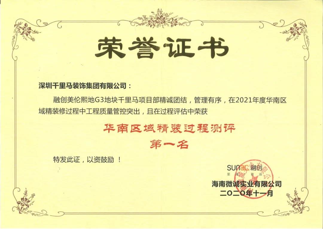 千里馬裝飾集團(tuán):融創(chuàng)美倫熙語項(xiàng)目榮獲“2021年度融創(chuàng)集團(tuán)精裝過程測評華南區(qū)域第一名”