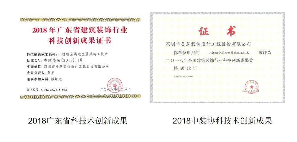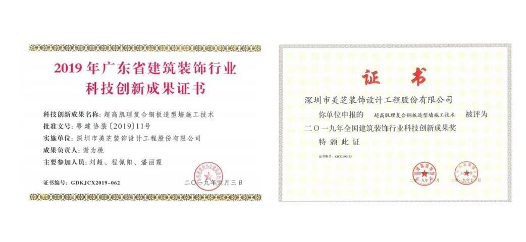 近日,中國建筑裝飾協會公布了2021年度“建筑裝飾行業科學技術獎”入選名單,美芝股份深圳建行大廈非公共區域精裝修設計施工一體化和幕墻工程榮獲“科技創新工程二等獎”;超高肌理復合銅板造型墻施工技術、不銹鋼金屬造型屏風施工技術2項技術榮獲“科技創新成果二等獎”。