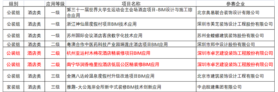 近日,由中國建筑裝飾協會舉辦的“第三屆建筑裝飾BIM大賽”公布了評審結果,卓藝裝飾承建的南寧華潤香格里拉酒店、杭州亞運村木棉花酒店兩項目獲評公裝組酒店類二級應用水平,重慶市北部新區別墅項目獲評幕墻組優秀應用水平。