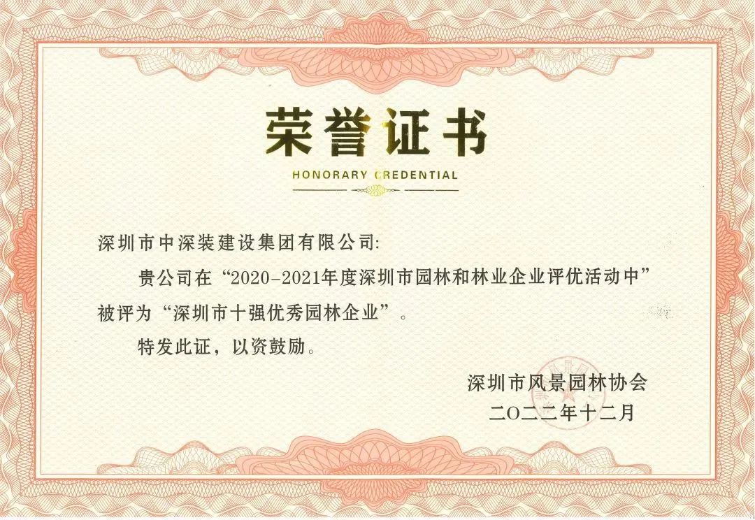 近日,中深裝集團收到深圳市風景園林協會頒發的“2020-2021年度深圳市園林和林業優秀企業”榮譽證書和牌匾,按照評選規則,評優總分位列前10名被授予“深圳市十強優秀園林企業”稱號,中深裝集團位列其中,此次獲獎,也是中深裝集團繼2010年獲評該稱號以來連續十一年獲此殊榮。