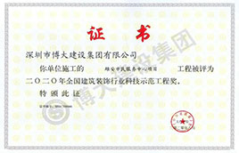 近日,由深圳市博大建設(shè)集團(tuán)有限公司(以下稱“博大建設(shè)集團(tuán)”)承建的“雄安市民服務(wù)中心項目”、“汝州市金融大廈幕墻”、“廈門航空金雁酒店裝修改造工程”、“中南置地格雷斯精選酒店(寧波高新區(qū)店)整體精裝修”共四項工程榮獲“2020年全國建筑裝飾行業(yè)科技示范工程獎”。