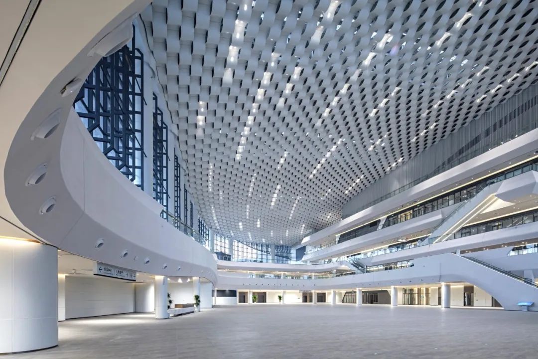 走進門廳,一股簡潔明快、清新大方的現代之風撲面而來。站在高大寬闊的大廳前,人顯得如此渺小。放眼望去,無論是那充滿海浪流動感的四層樓裙,還是那連綿起伏、波瀾涌動的波浪形吊頂,亦或是那鑲嵌在波浪之中宛如明珠般的點點燈光,都讓人有一種身臨浩瀚大海之感。主登錄廳也是整個會展中心最具特色、最核心、最重要的區域之一。