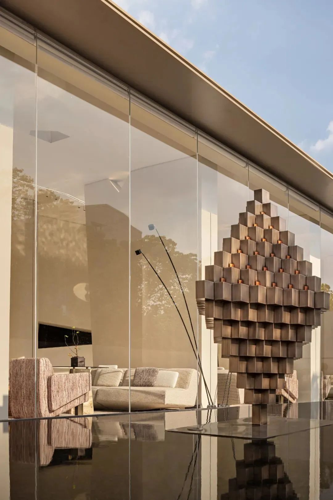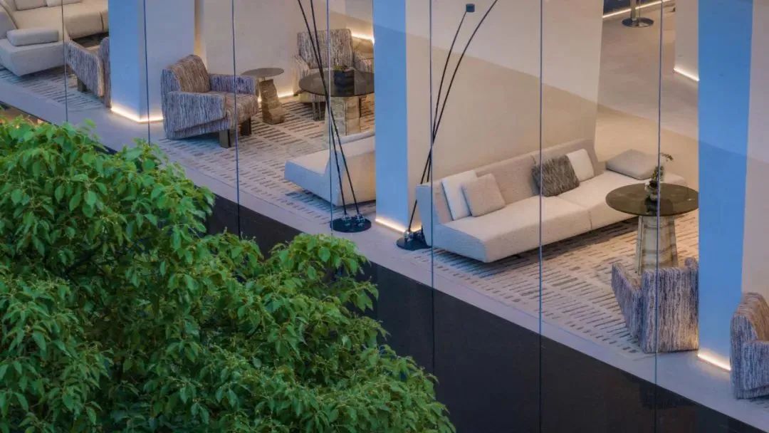 在整個生活館中,人們的體驗在氛圍、光線和質感方面的明顯差異之間取得平衡,從隱匿在山谷頂上的天光到光線充足的臨水洽談區,上升與下降,內部與外部、地面與天空或城市與自然之間的并列,喚起類似山谷游玩的相似感受。