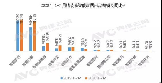 據奧維云網(AVC)地產大數據檢測顯示,2020年1-7月全國精裝修新開盤項目1592個,同比下降23.1%,其中智能家居配套率達82.2%,較去年同期上升了7個百分點。可見,2020年以來,房地產精裝市場智能家居配套率穩中有升。