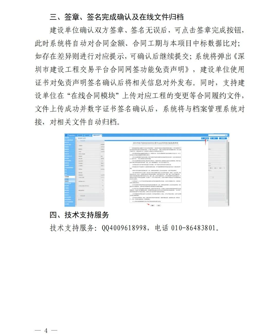 合同網(wǎng)簽參照現(xiàn)行紙質(zhì)合同簽訂方式,由合同雙方對(duì)擬定合同進(jìn)行單位電子簽章(公章)和法人(授權(quán)人)電子簽名。合同雙方可根據(jù)實(shí)際情況,參照《深圳市建設(shè)工程合同網(wǎng)簽電子簽名印章辦理指南》(詳見(jiàn)附件1)選擇辦理合同網(wǎng)簽所需電子簽名簽章。招標(biāo)建設(shè)工程在確定中標(biāo)人后,按照《深圳市建設(shè)工程交易平臺(tái)網(wǎng)簽操作指引》(詳見(jiàn)附件2)進(jìn)行合同網(wǎng)簽,并即時(shí)上傳歸檔合同履行中相關(guān)文件資料。