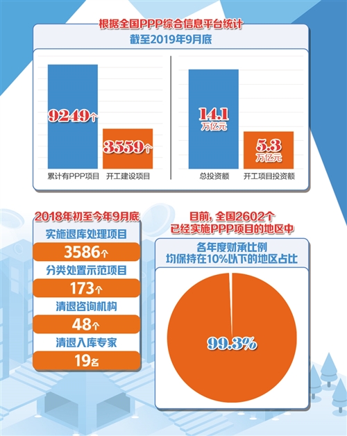 2018年初至今年9月底,財(cái)政部共對(duì)3586個(gè)項(xiàng)目實(shí)施退庫(kù)處理,分類處置173個(gè)示范項(xiàng)目,清退48個(gè)咨詢機(jī)構(gòu)和19名入庫(kù)專家。目前,在全國(guó)2602個(gè)已經(jīng)實(shí)施PPP項(xiàng)目的地區(qū)中,99.3%的地區(qū)各年度財(cái)承比例均保持在10%以下。
